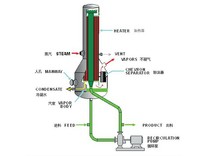 需濃縮的料液由泵送入加熱管頂部,沿著加熱管內(nèi)壁形成液膜向下流動(dòng)。在這個(gè)過程中,由于管外的加熱,管內(nèi)液膜開始沸騰并部分蒸發(fā)。在列管下部分及其下游的分離器中,剩余的液體和蒸汽得以分離。